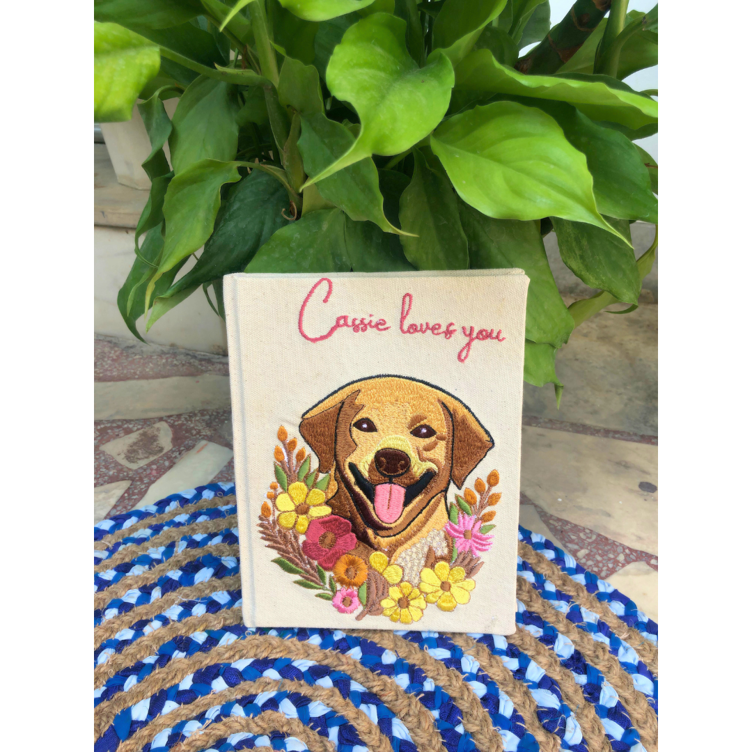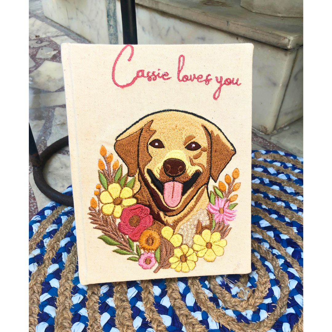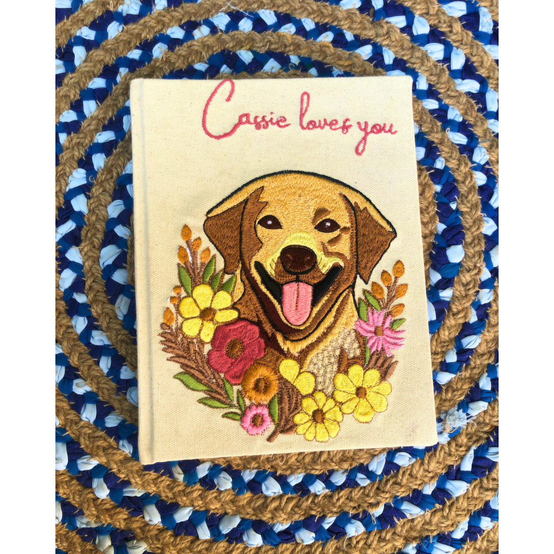 Introducing the Diary—a charming, hand-embroidered journal featuring the adorable face, a happy dog surrounded by a vibrant bouquet of flowers.