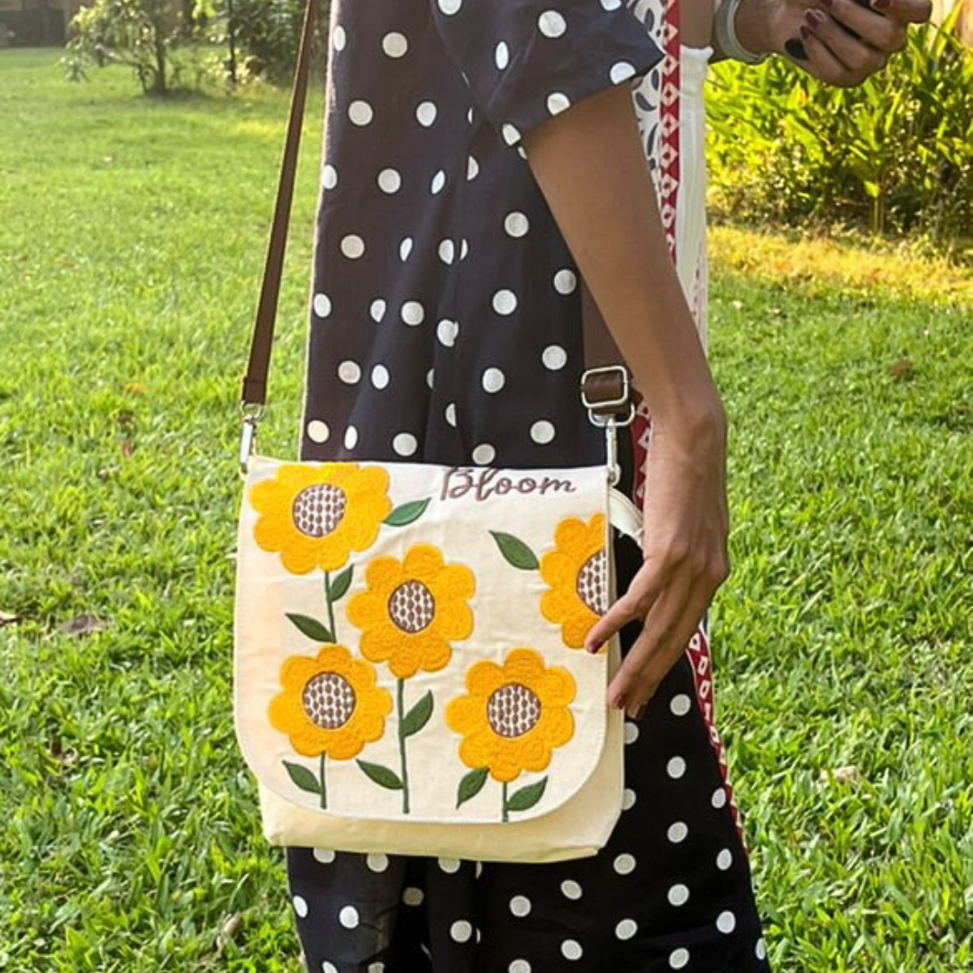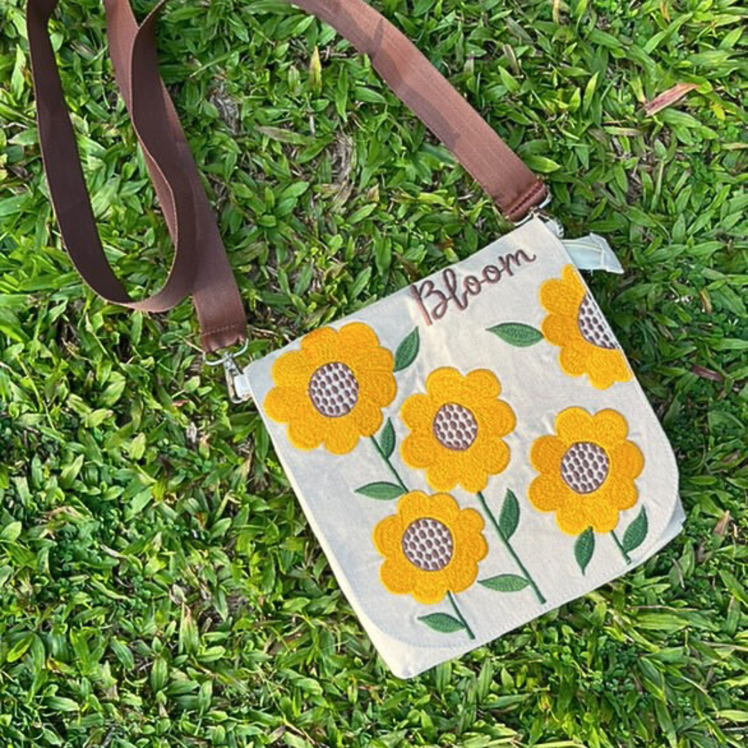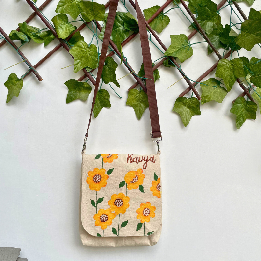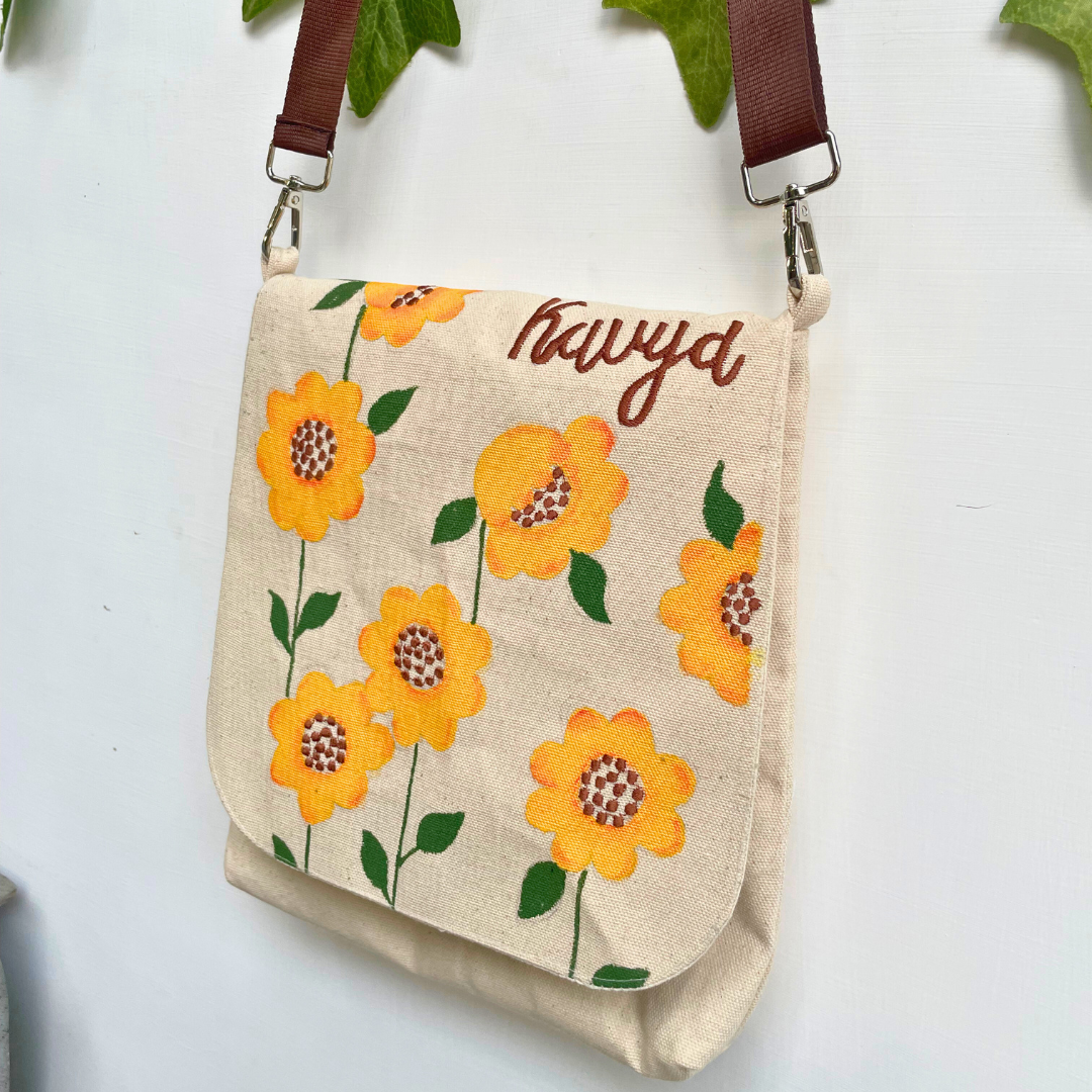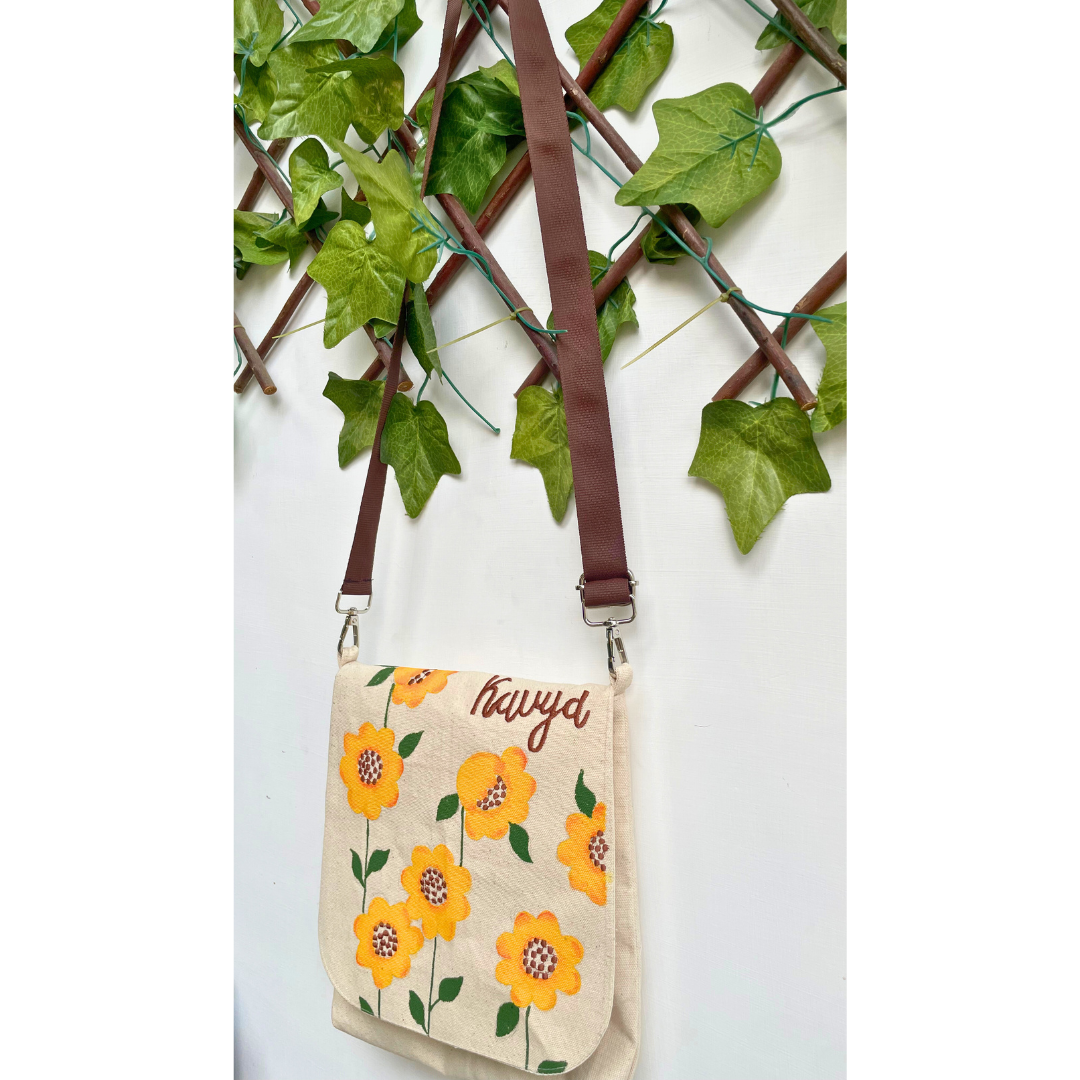 This charming sunflower sling bag is a perfect blend of style and functionality. Made from a soft, durable fabric, it features a beautiful hand-painted sunflower design that brings a touch of nature to your look.