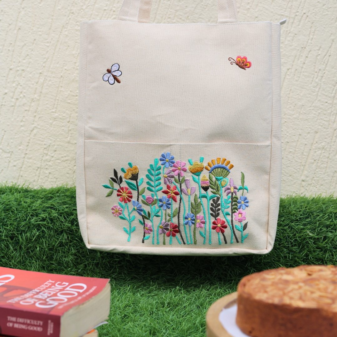 Our Floral Embroidered Canvas Tote—a blend of charm, color, and craftsmanship. With intricate floral embroidery on the front, it’s a timeless must-have for everyday use.