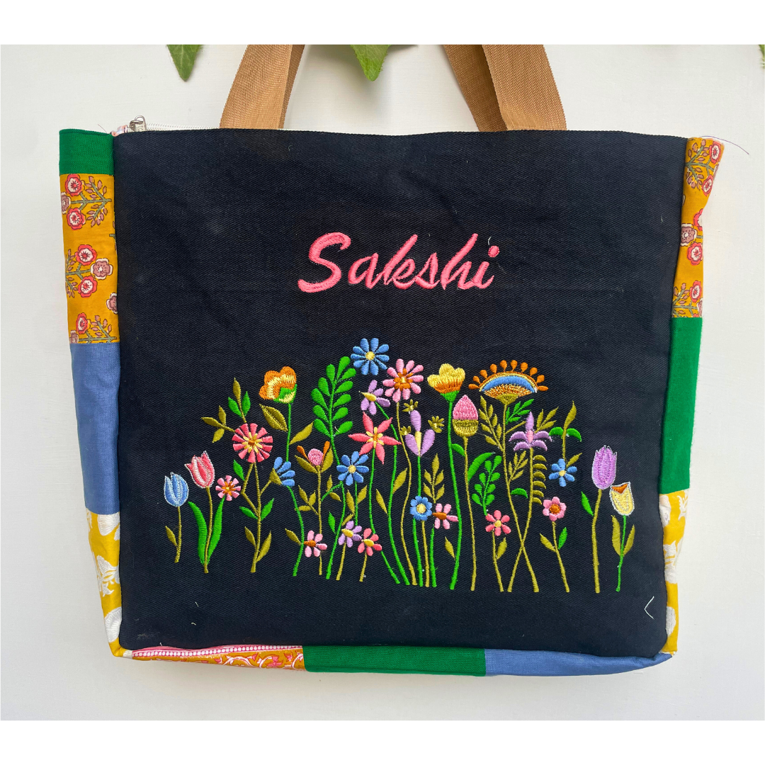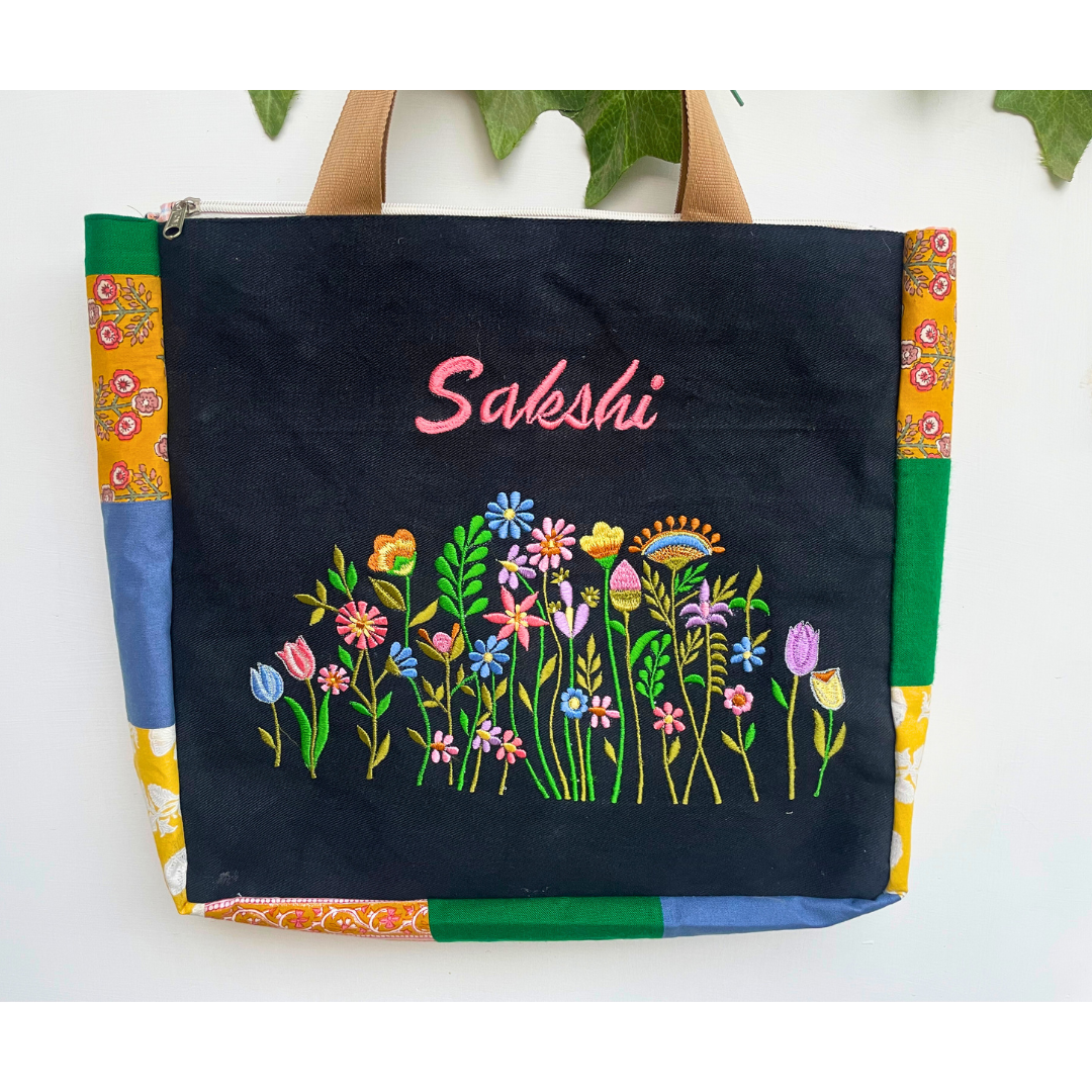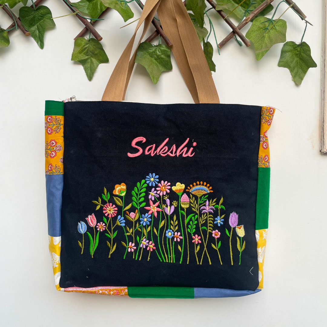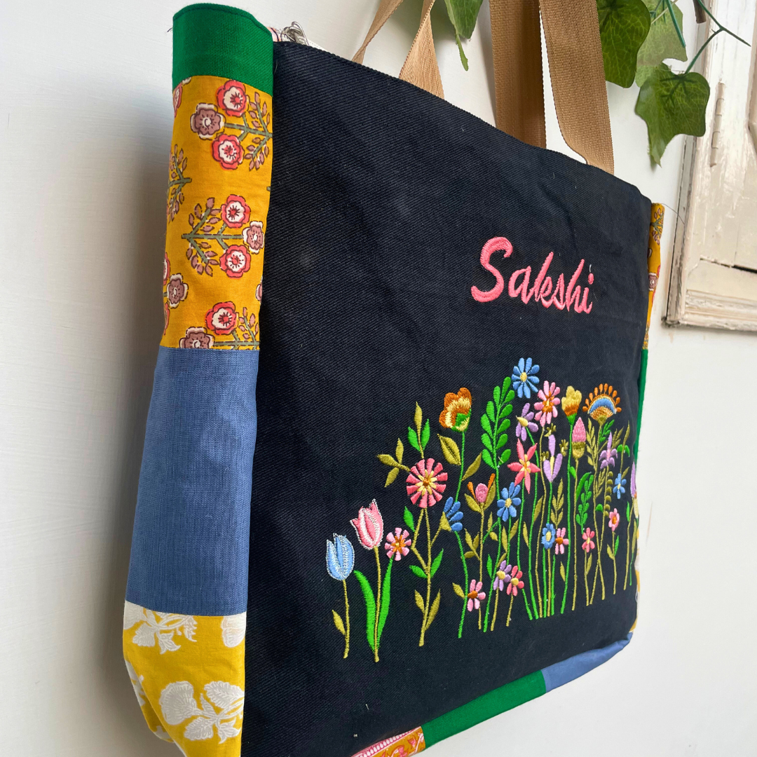 A beautiful canvas tote bag that features a colorful floral embroidered (machine and hand embroidered) design at the front and patchwork detailing along the sides, makes it a must-have!