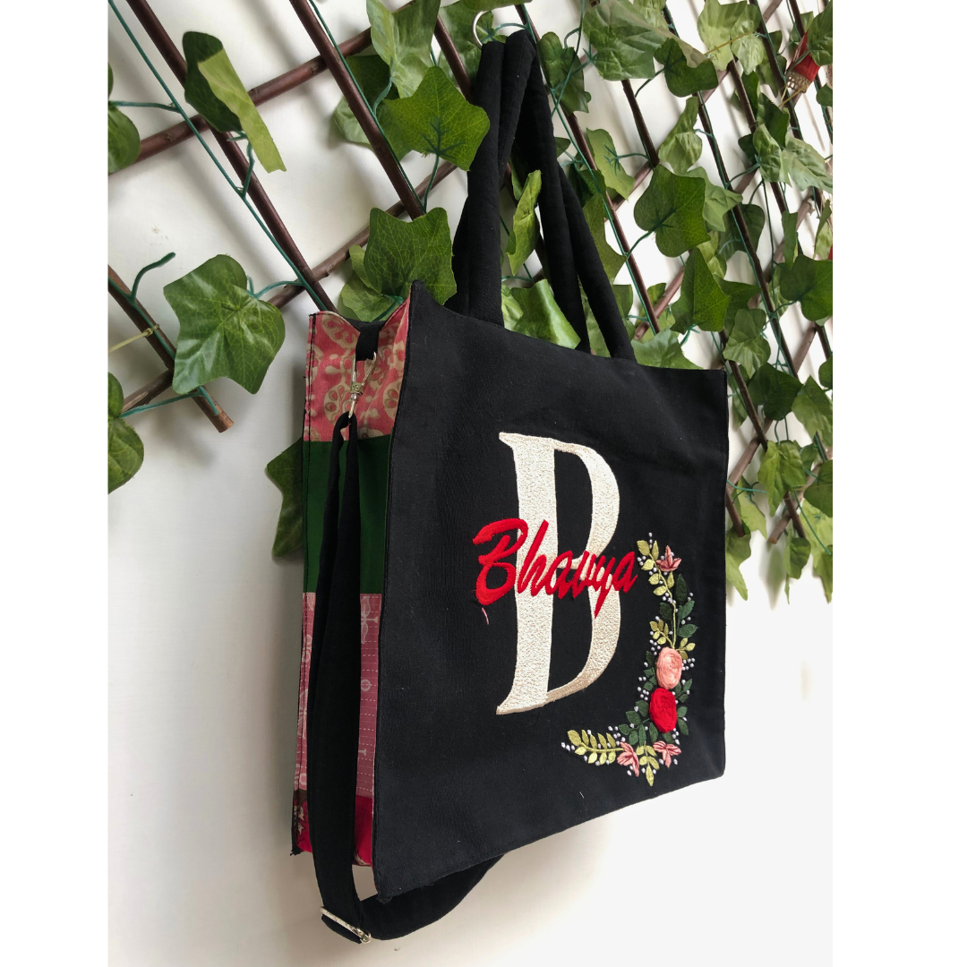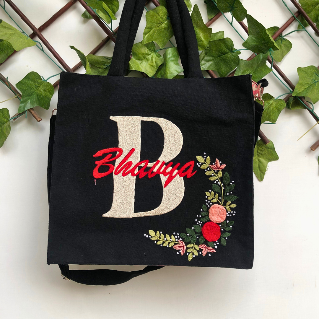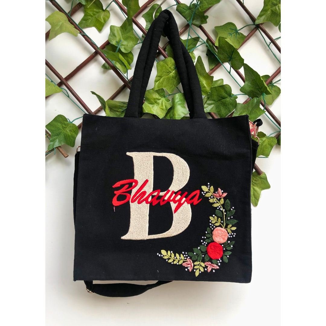 This chic and personalized tote bag is crafted from durable black fabric, making it both stylish and practical.
