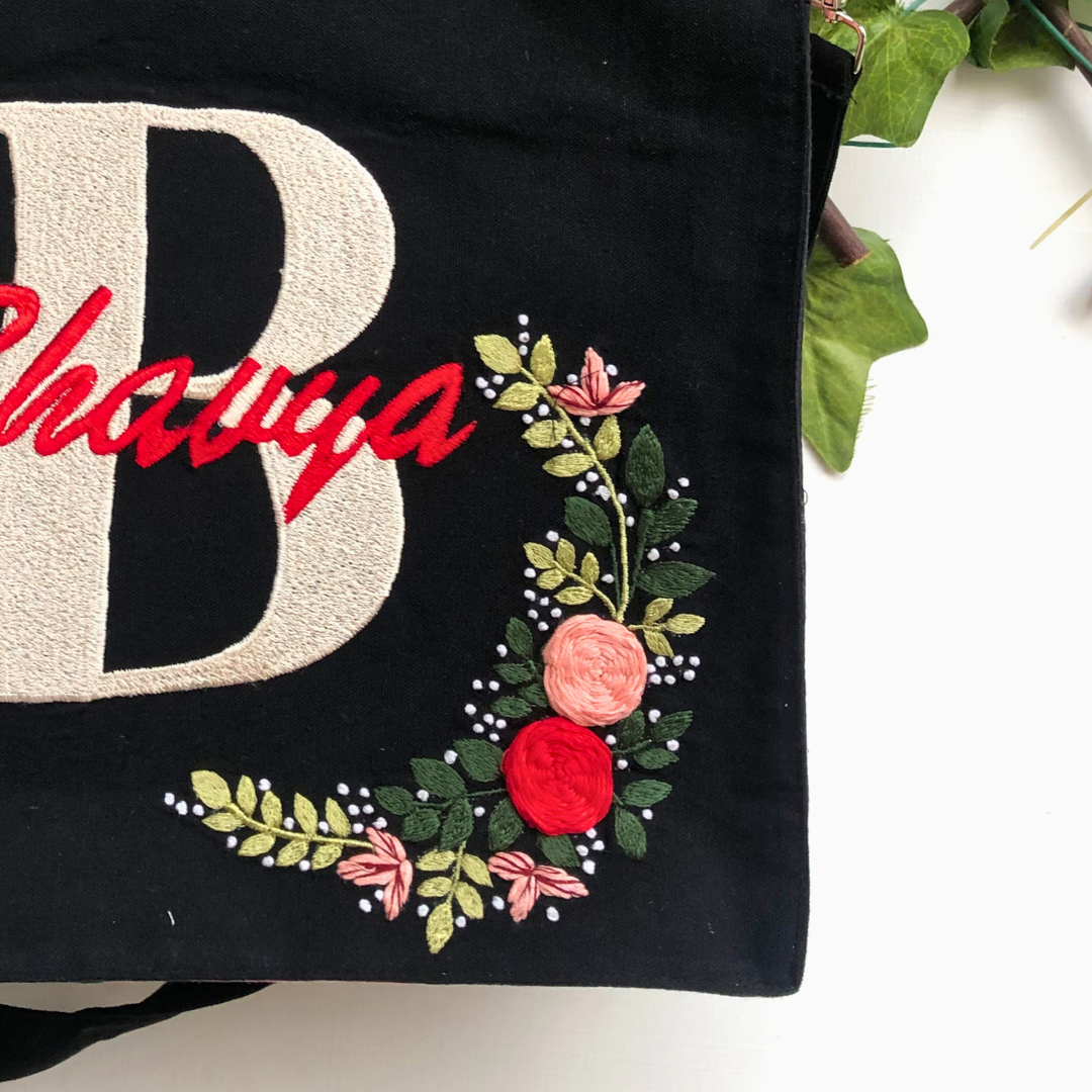 To the right of the lettering, a beautiful floral embroidery design blooms in a cascade of colors. Delicate green leaves intertwine with blossoms in shades of pink, coral, and red, bringing a fresh and lively contrast to the bag's overall design.
