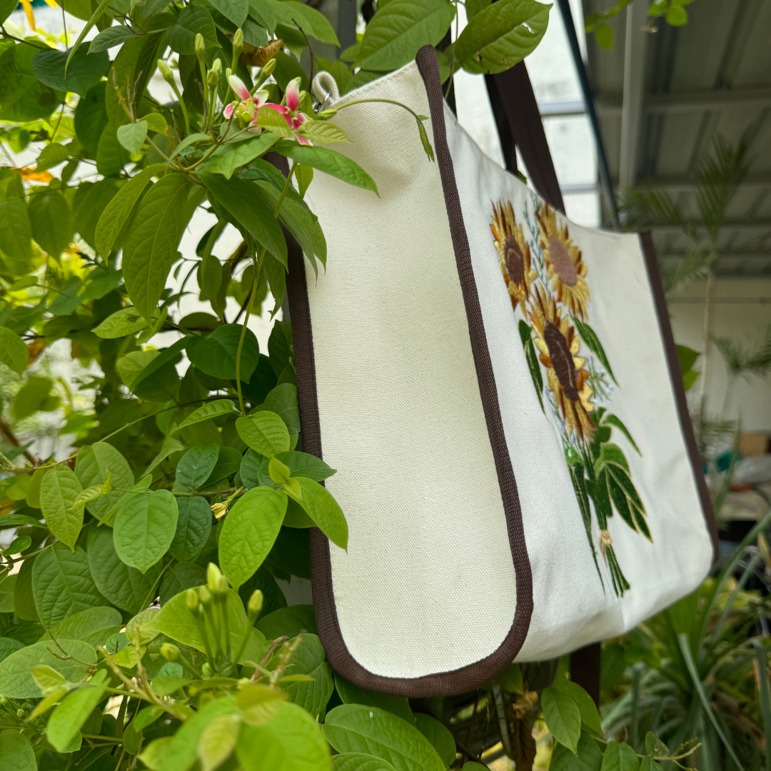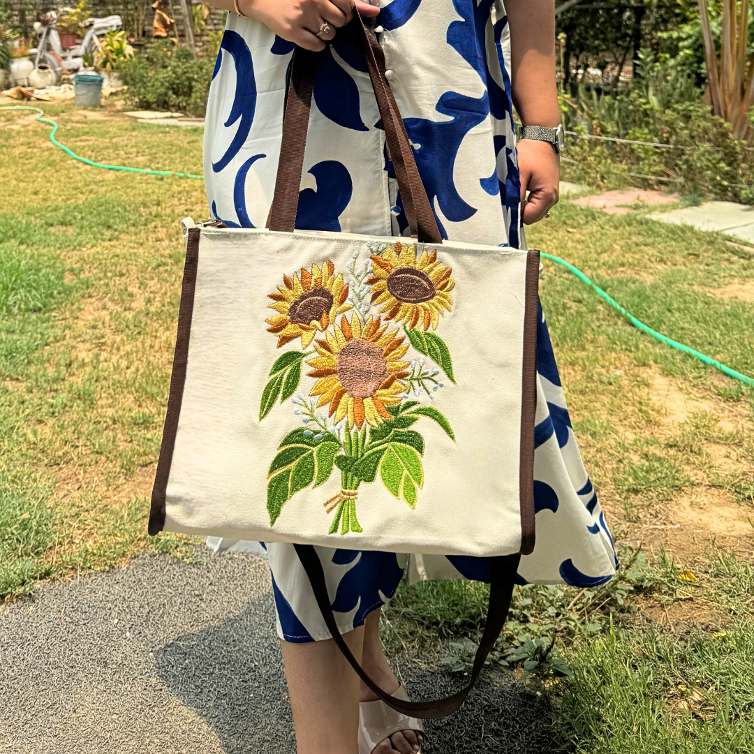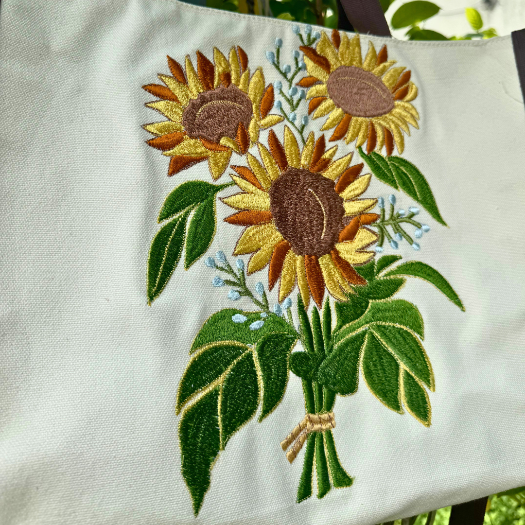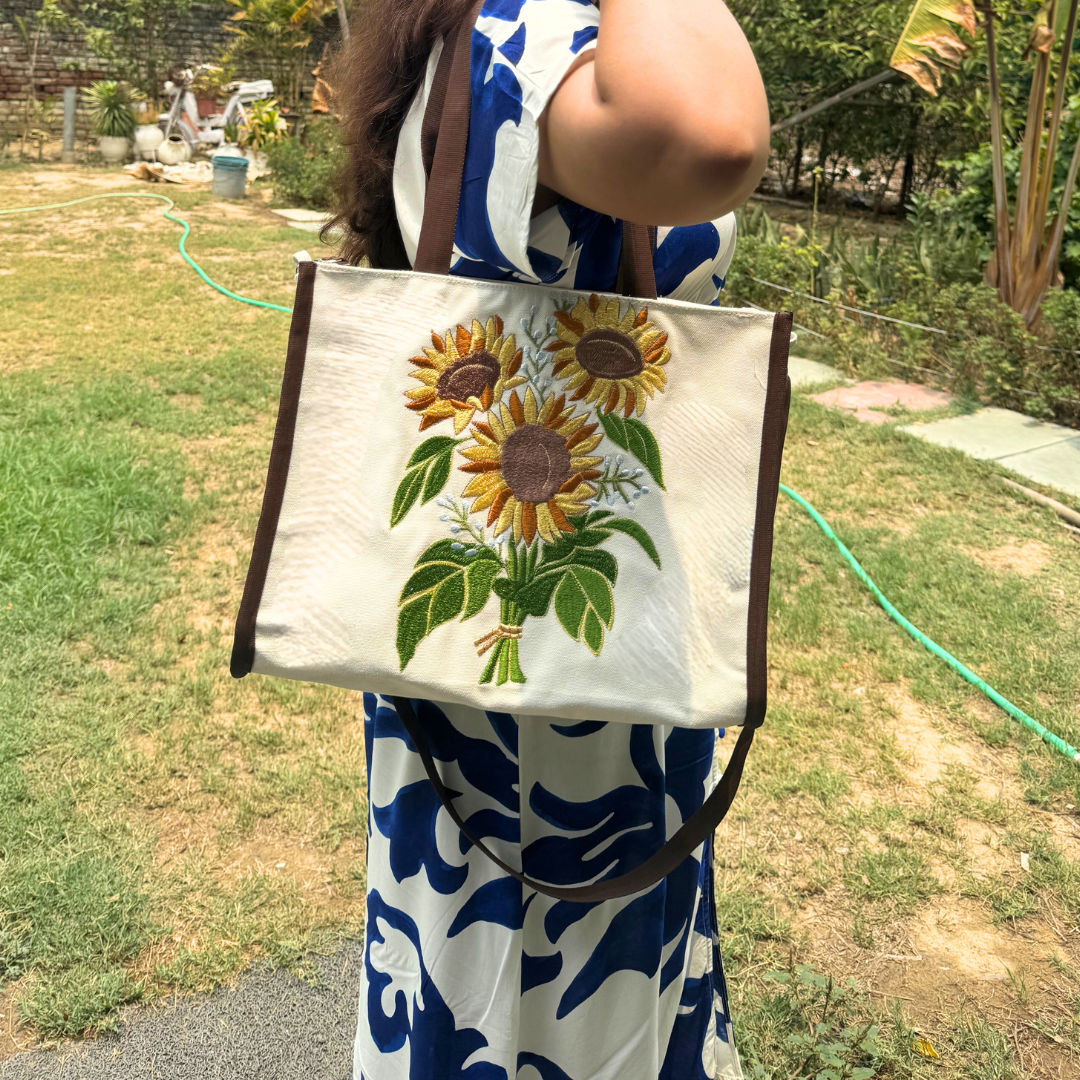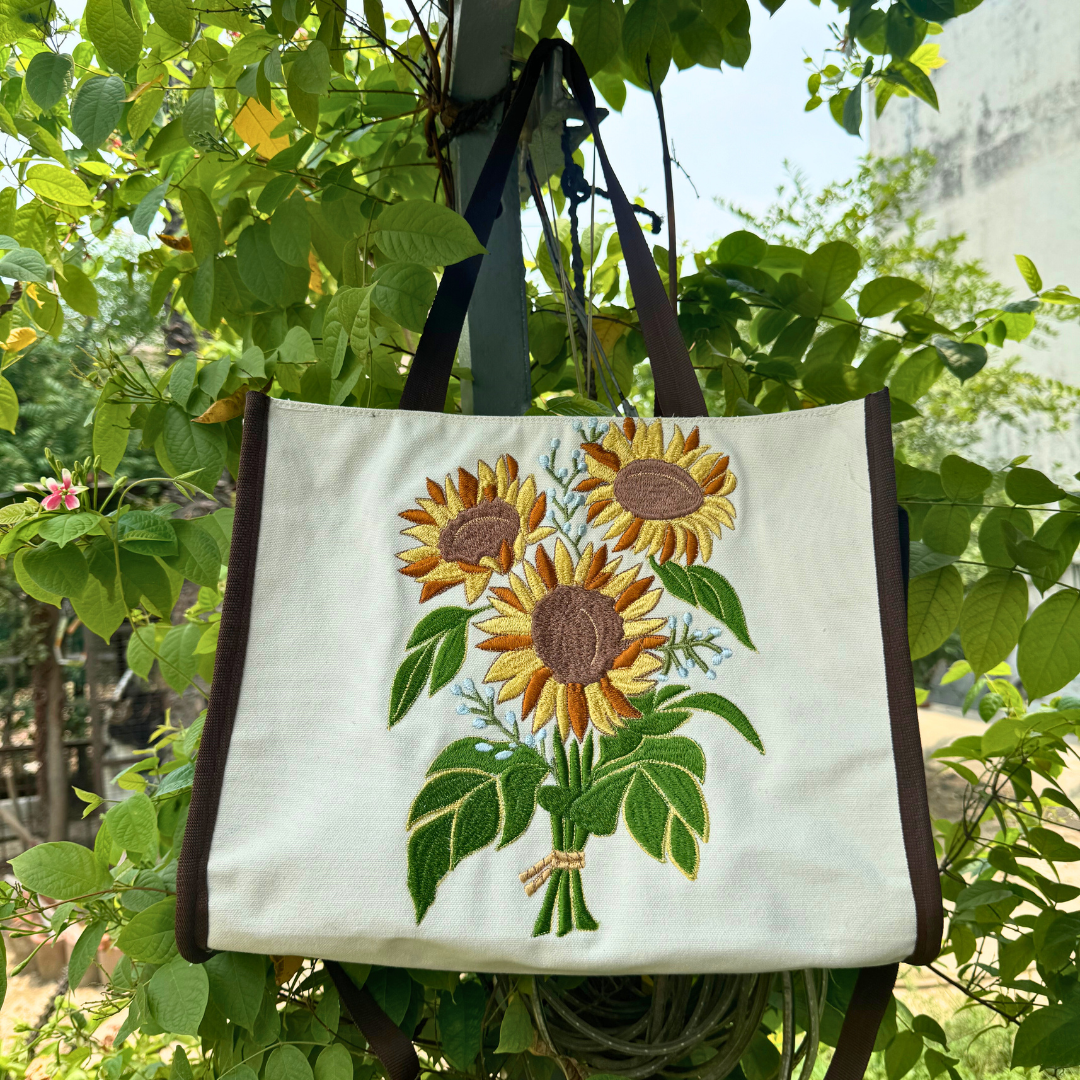 Elevate your everyday style with our Canvas Tote Bag adorned with hand-embroidered sunflower bouquet detailing