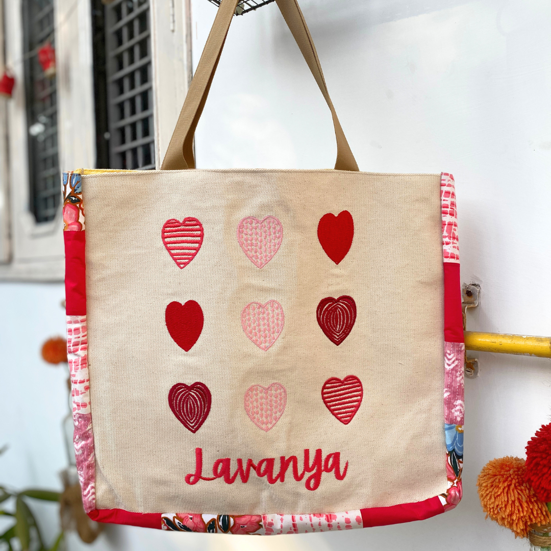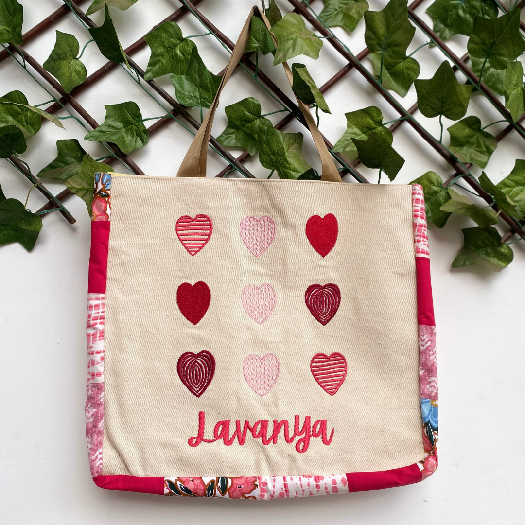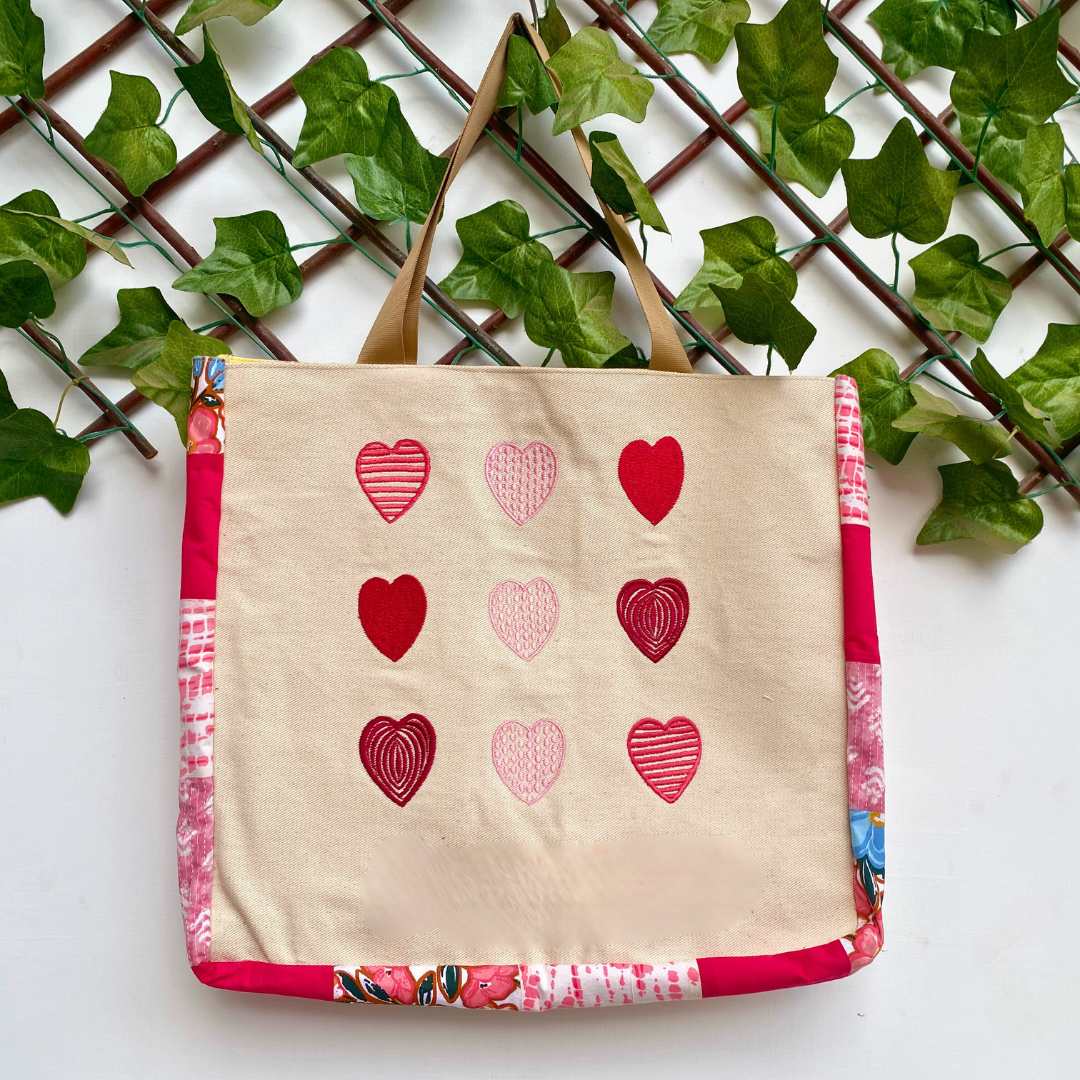 A beautiful canvas tote bag that features hearts embroidered design at the front and patchwork detailing along the sides, makes it a must-have tote bag