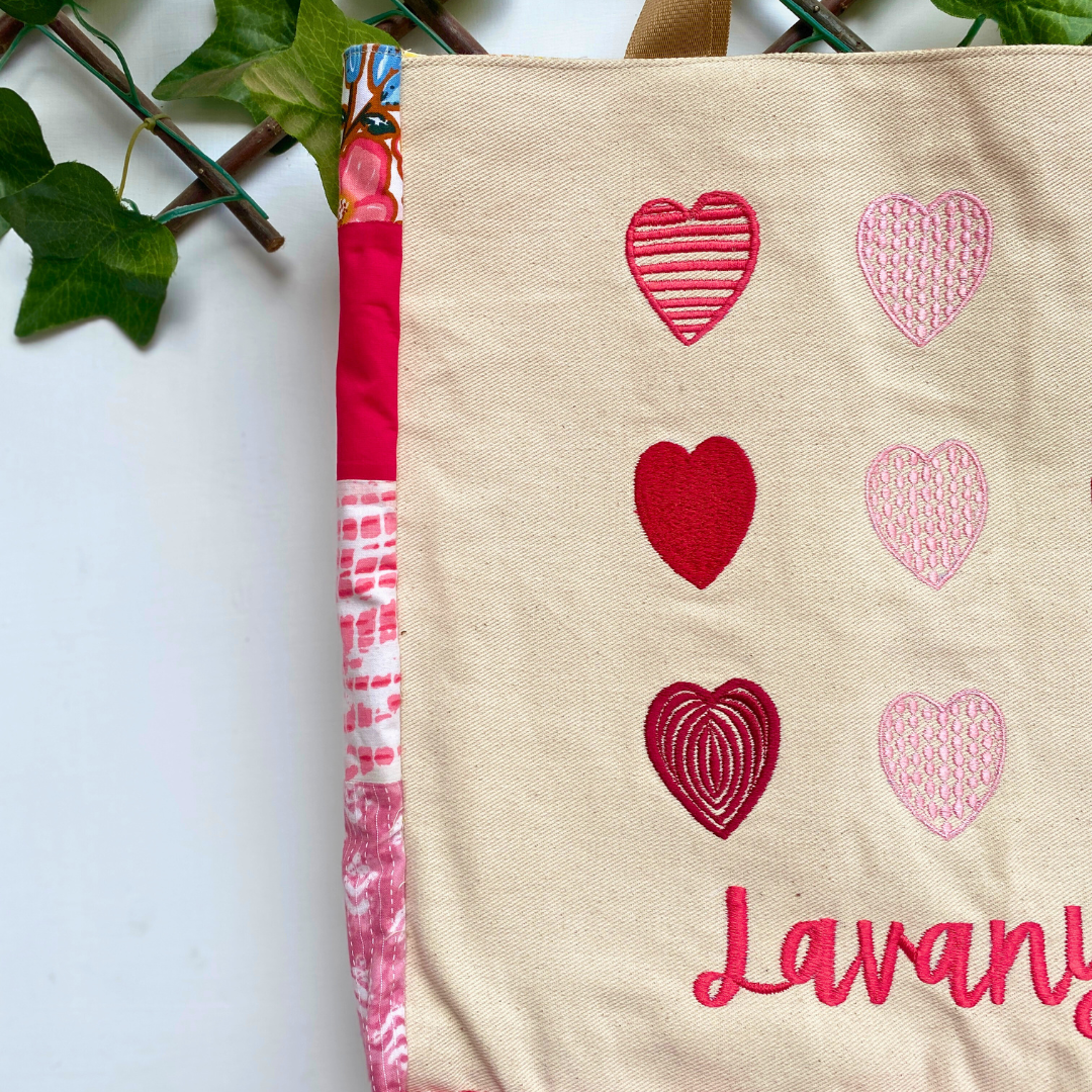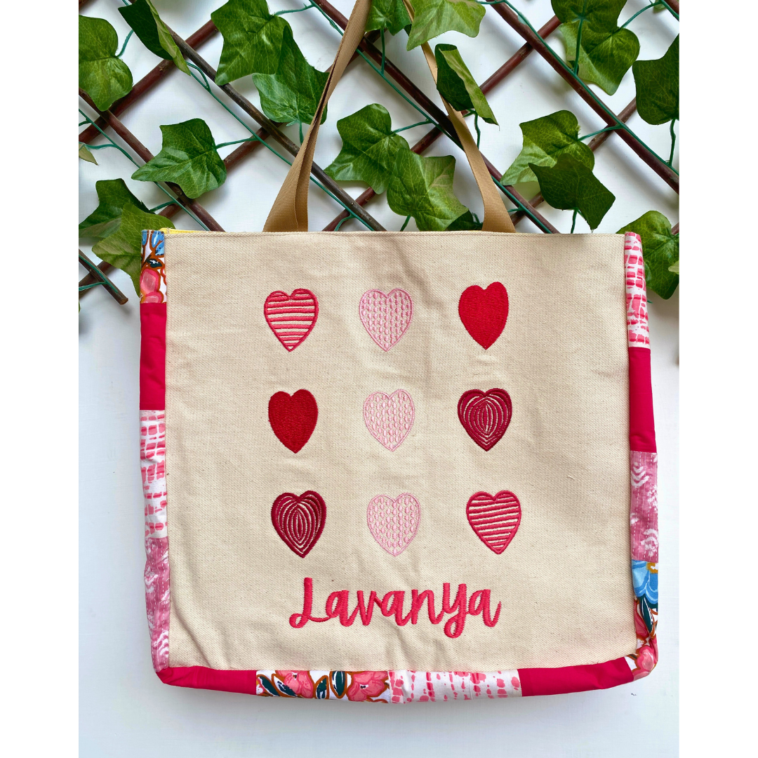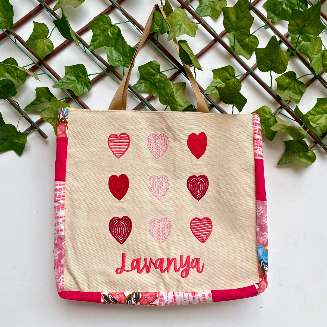 A beautiful canvas tote bag that features hearts embroidered design at the front and patchwork detailing along the sides, makes it a must-have tote bag