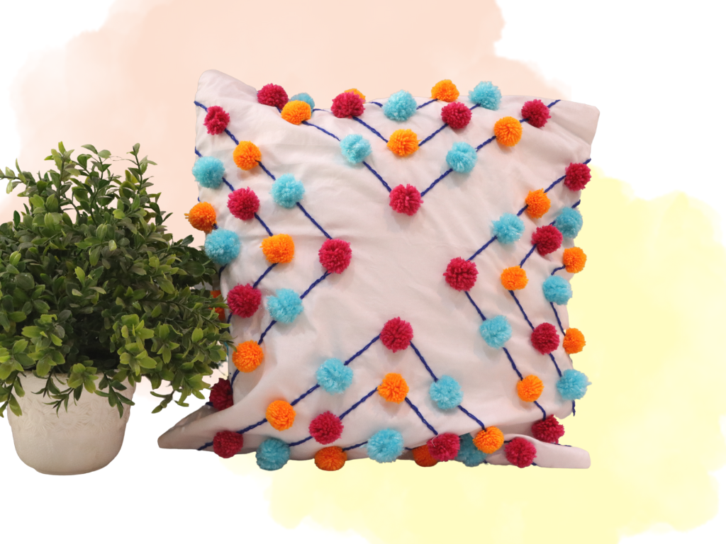 Dieser handgefertigte Pompon-Kissenbezug verleiht Ihrem Wohnraum einen Hauch von Farbe. Es besteht aus nachhaltigen Materialien, sodass Sie Ihr Wohnzimmer ohne schlechtes Gewissen damit dekorieren können!