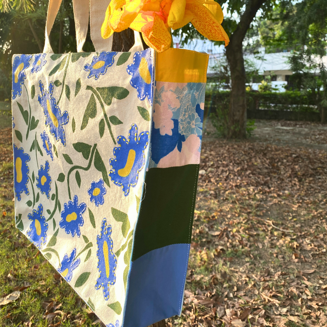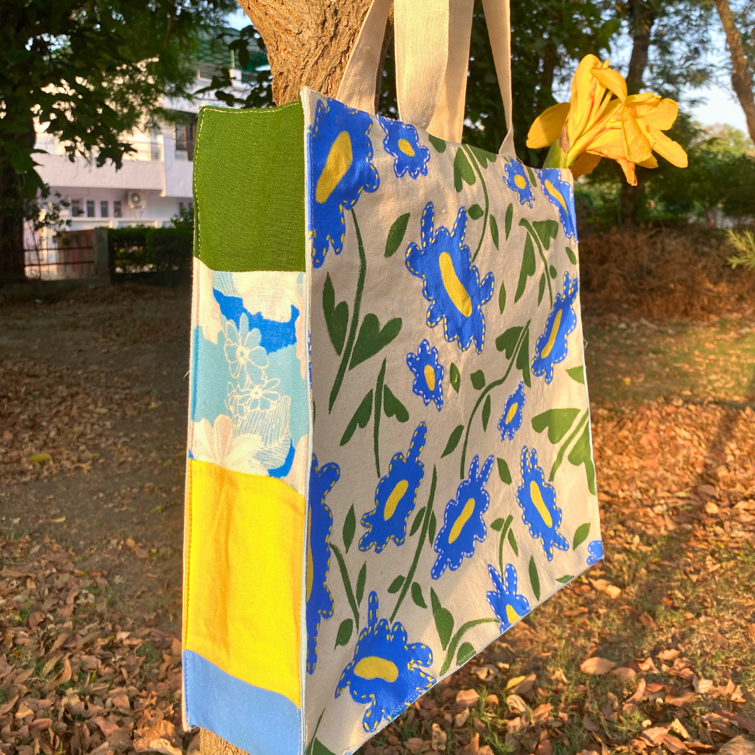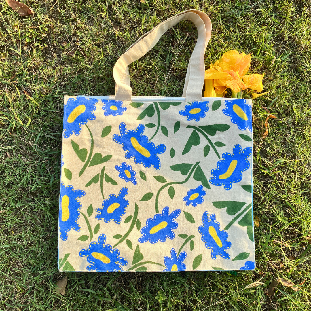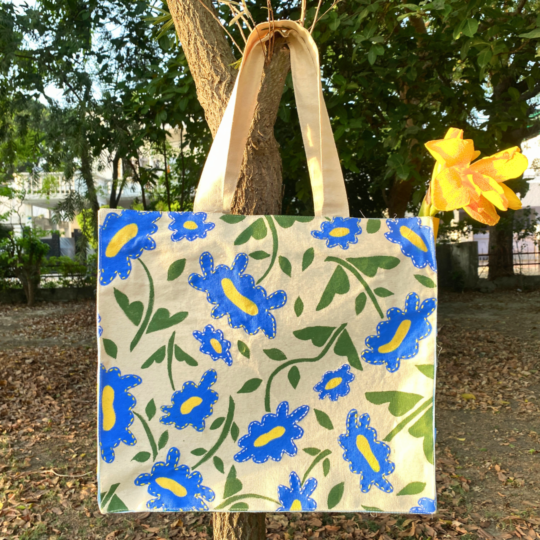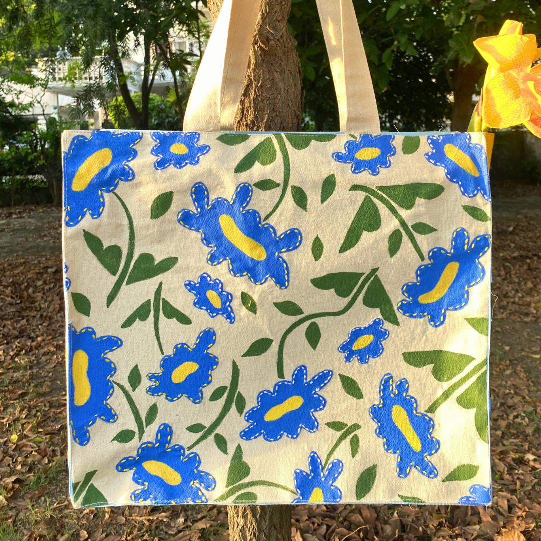 Elevate your everyday style with our Canvas Box Tote Bag adorned with hand-painted blue and yellow flowers with hand-embroidered detailing.