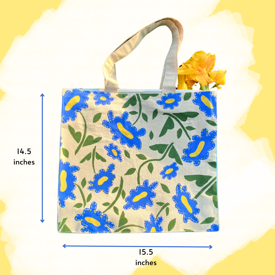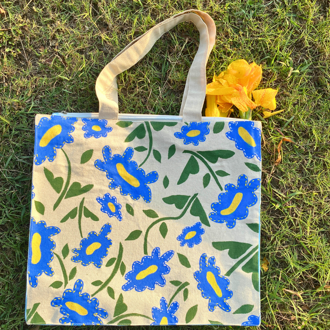 Elevate your everyday style with our Canvas Box Tote Bag adorned with hand-painted blue and yellow flowers with hand-embroidered detailing.