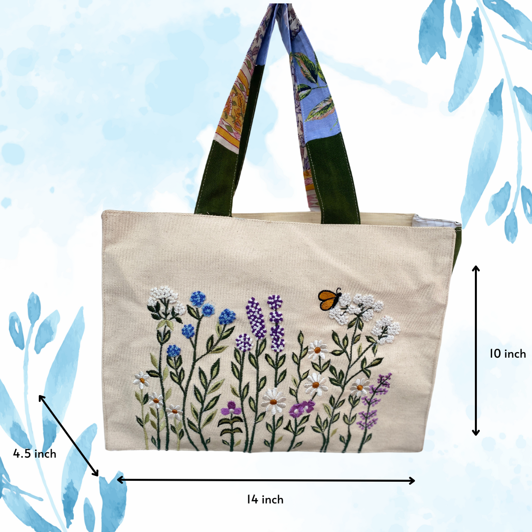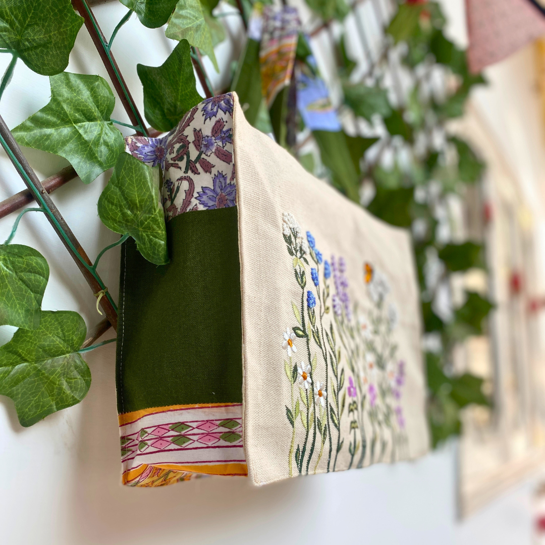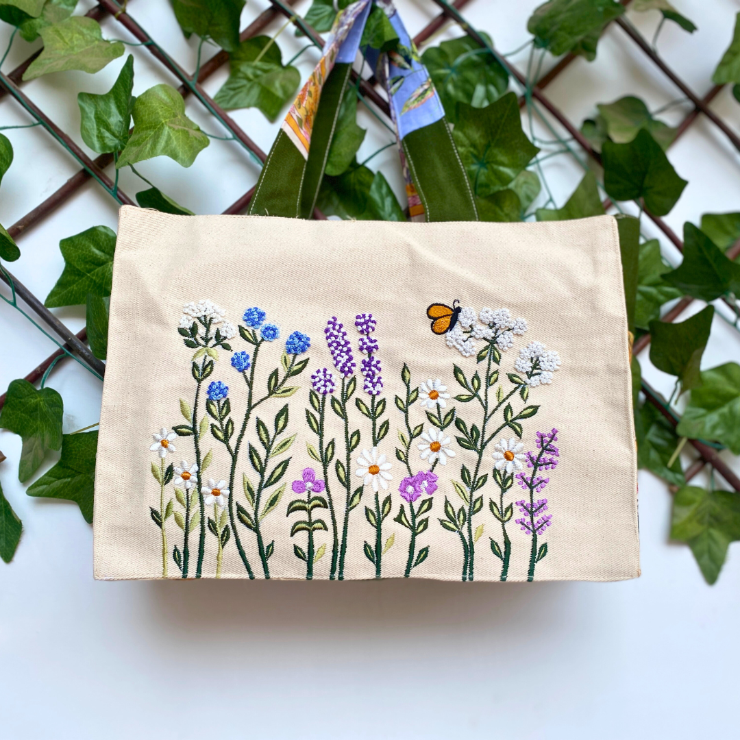Our Garden Delight Box Tote Bag is a perfect mix of colour, craftsmanship, and everyday style. With detailed floral embroidery on the front and patchwork accents along the sides, it’s a statement piece that’s both practical and beautiful.