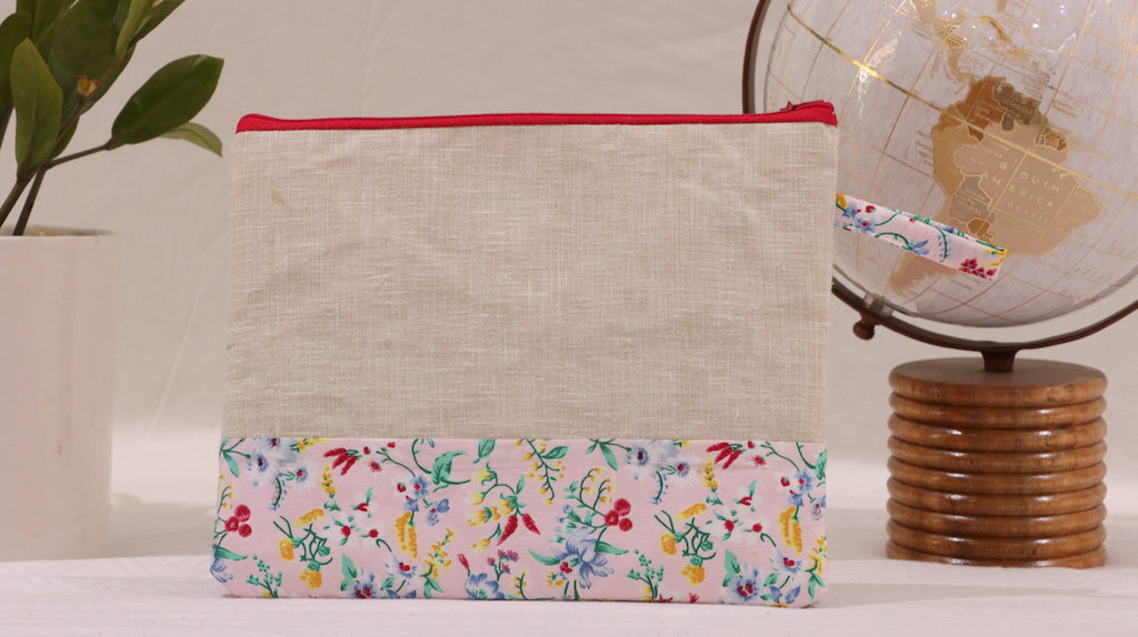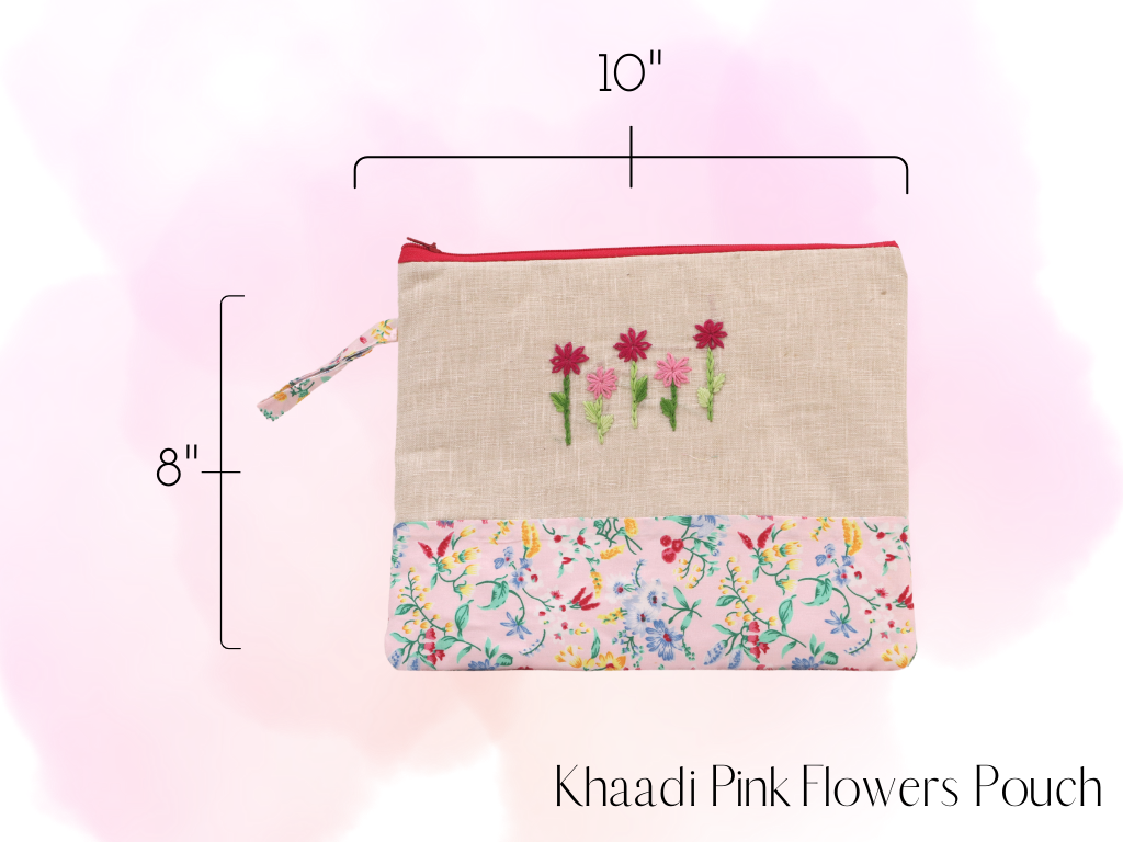 Un bolso imprescindible con un intrincado y delicado bordado floral sobre tela khadi para añadir a tu colección de accesorios. Esta preciosa bolsa khadi reciclada se puede utilizar como bolsa de maquillaje, estuche de viaje, bolsa, organizador, etc. Te encantará el diseño, el estuche y la longevidad. El diseño refrescante ha sido elaborado por Rekha, miembro de nuestro equipo.