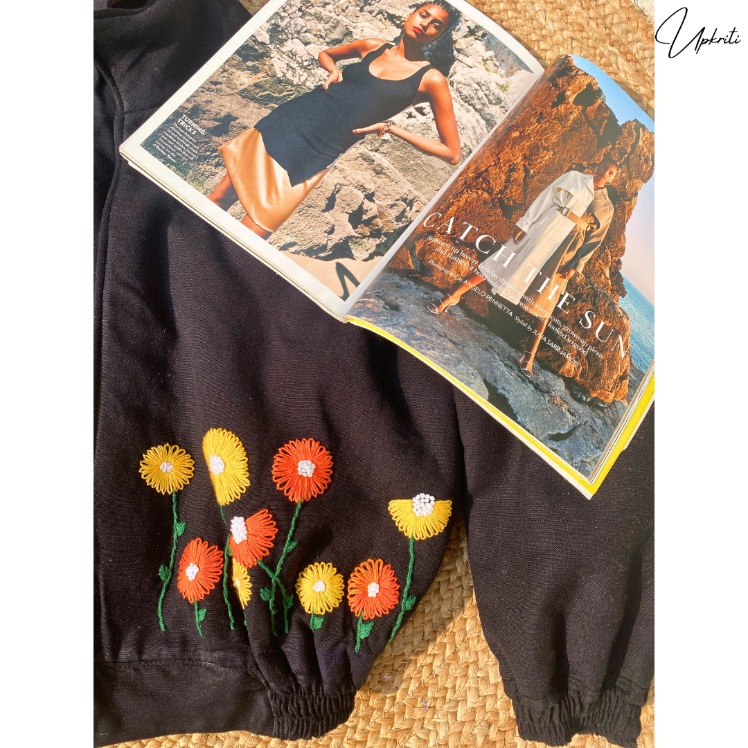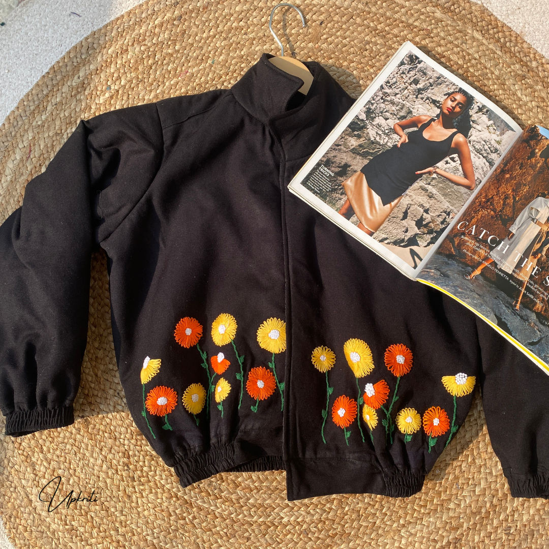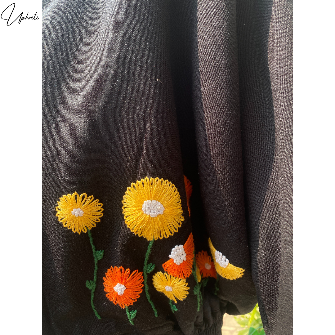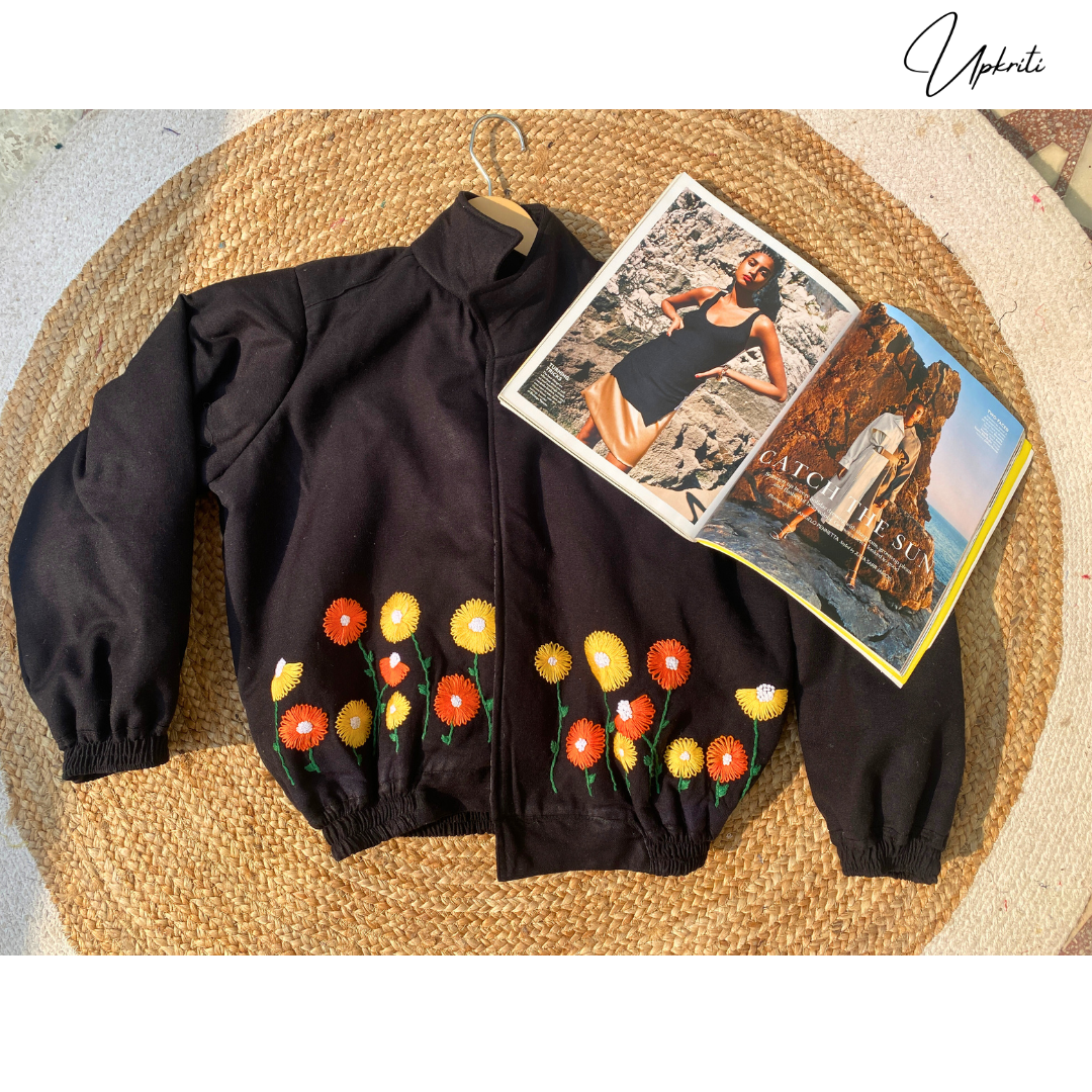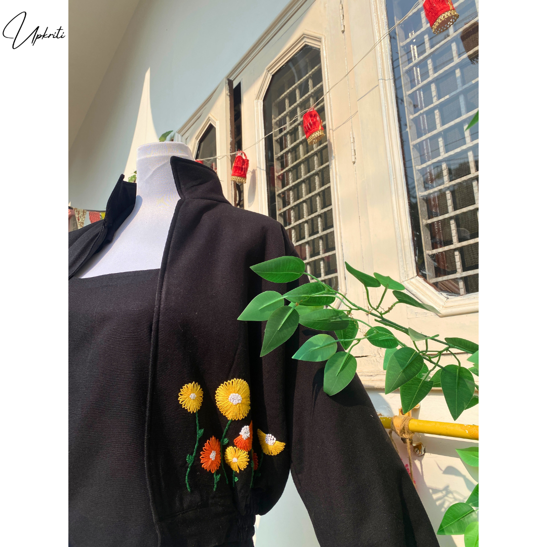 Presentamos la chaqueta de lana negra bordada a mano más hermosa de Upkriti.