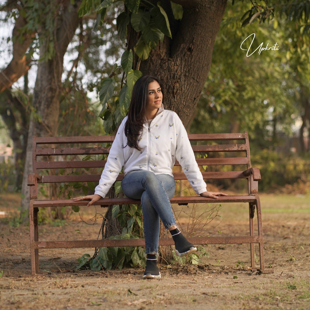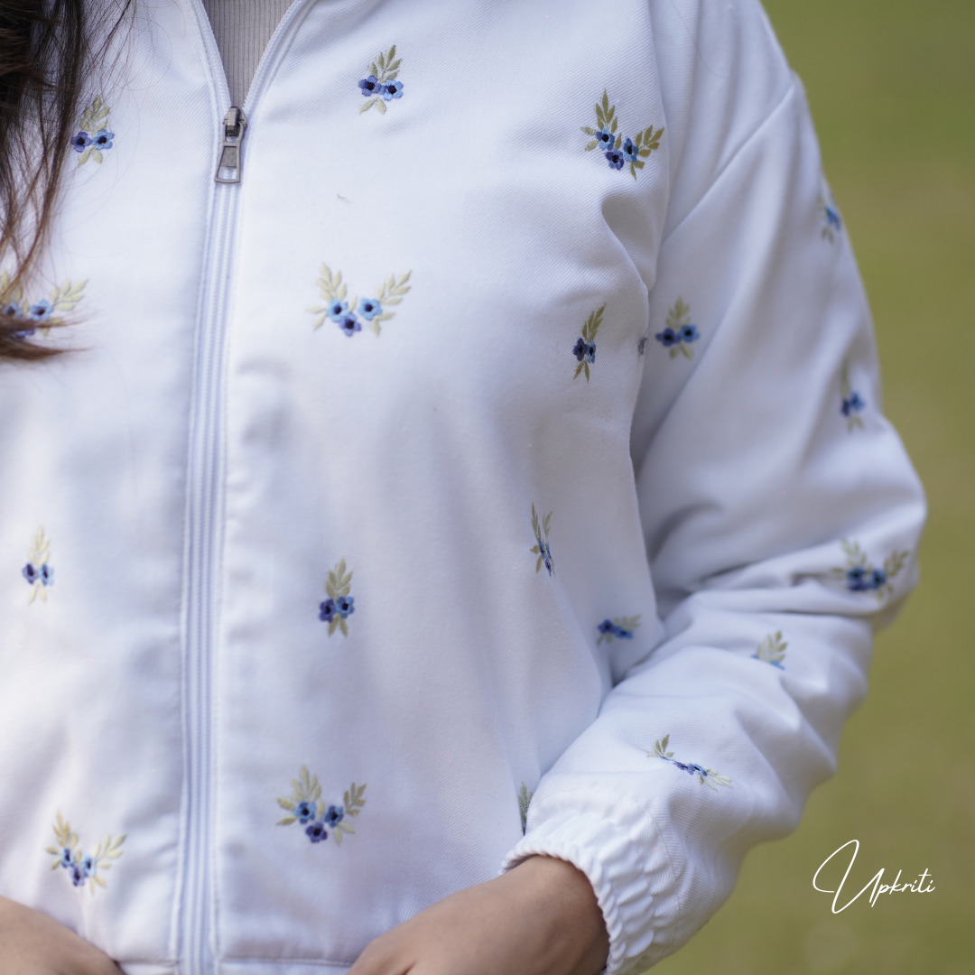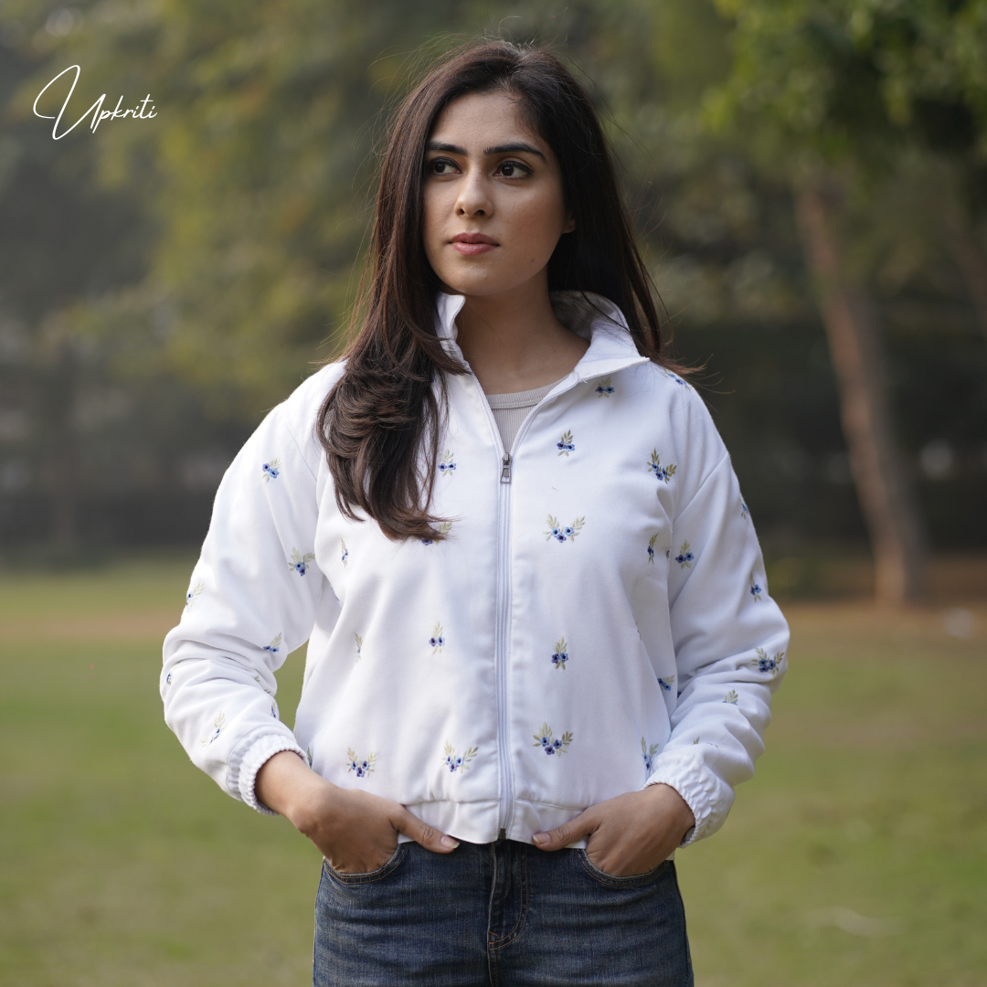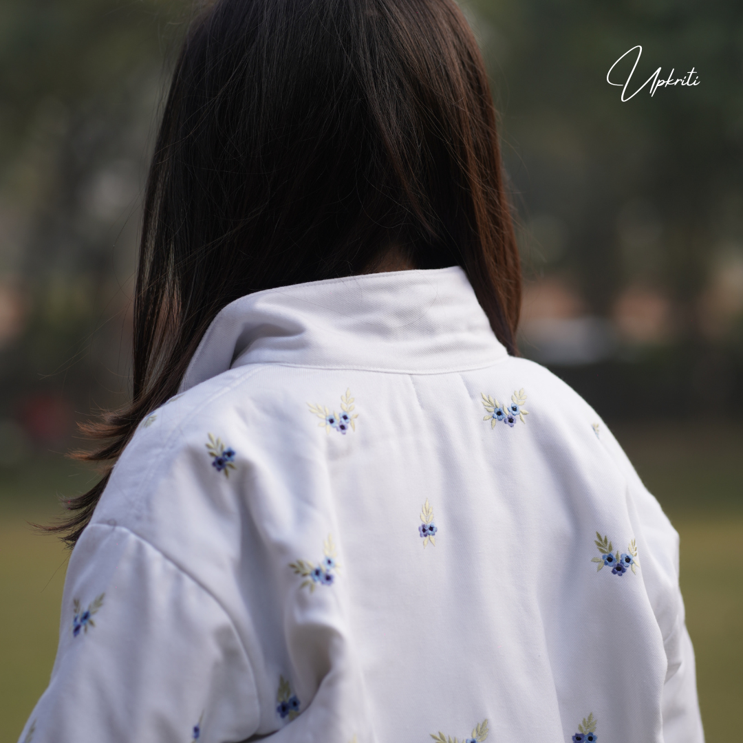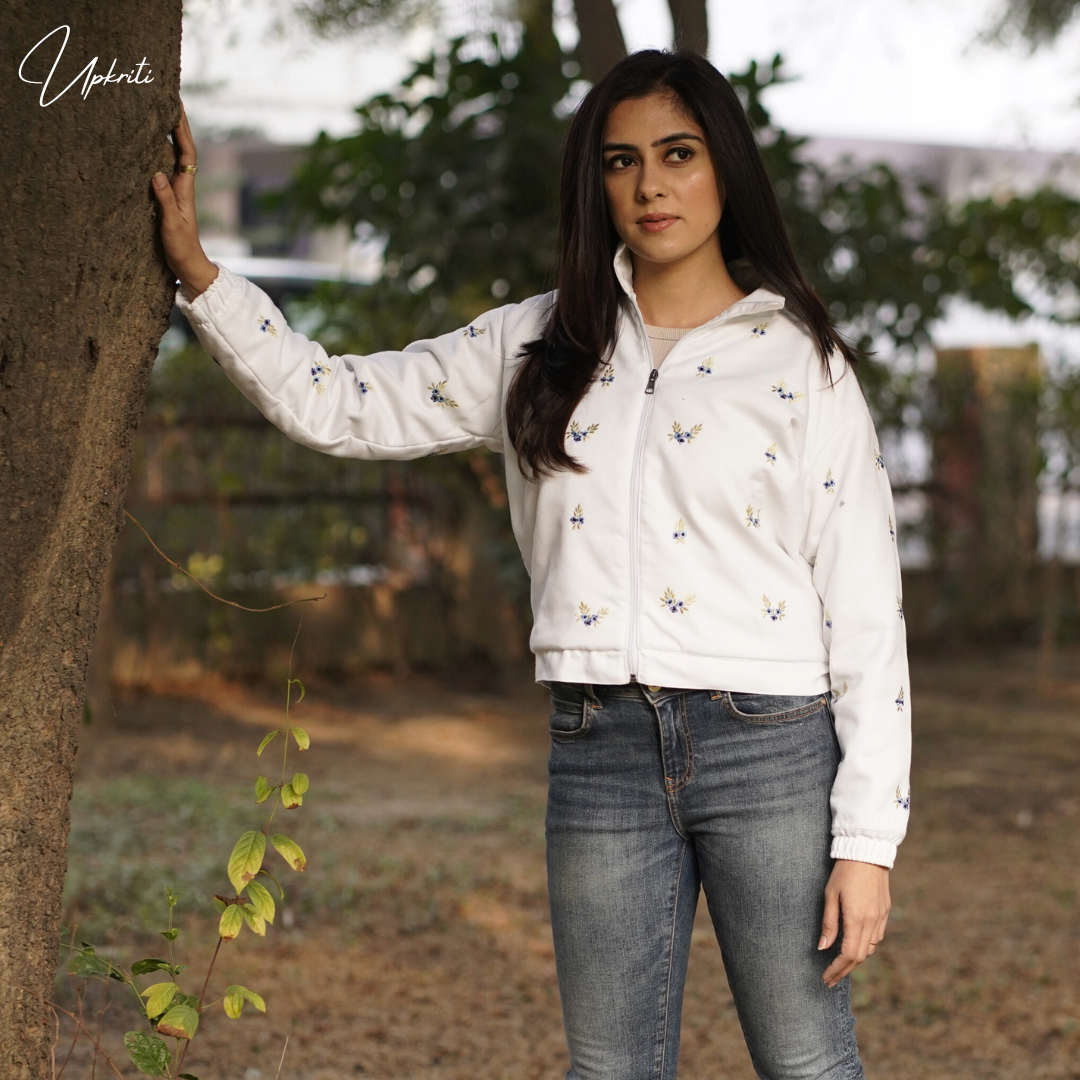 Presentamos la chaqueta de lana blanca con bordado floral de Upkriti.