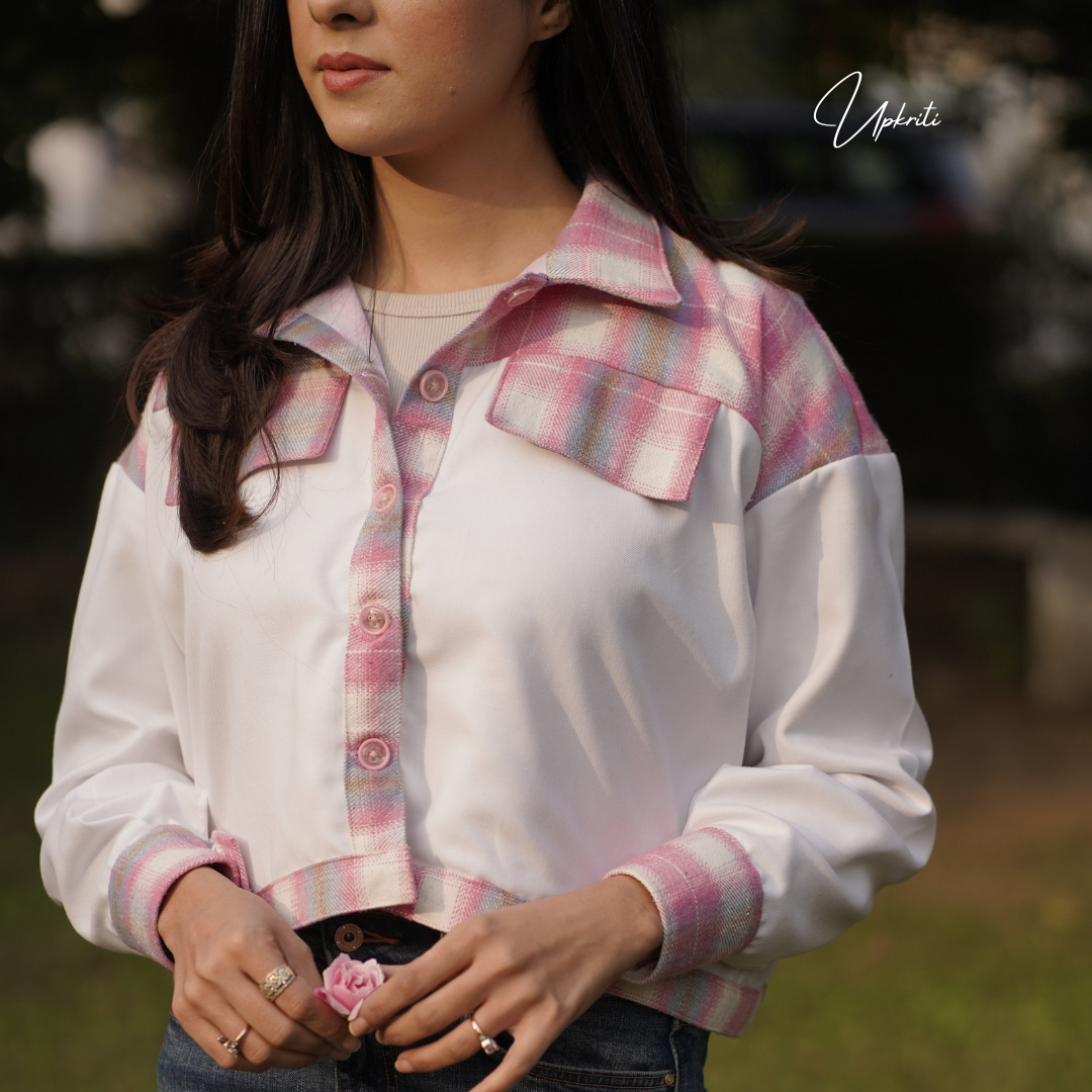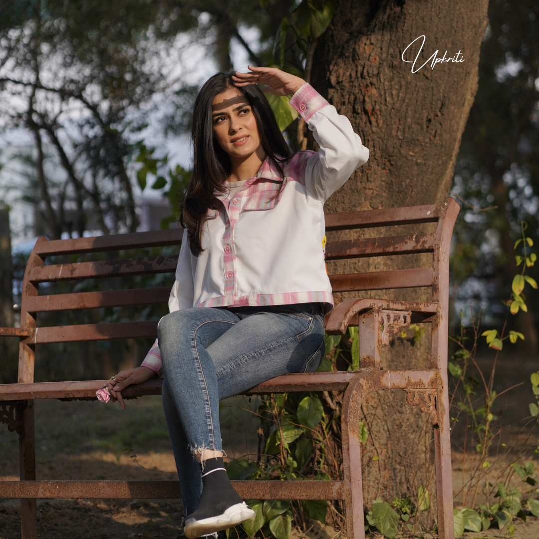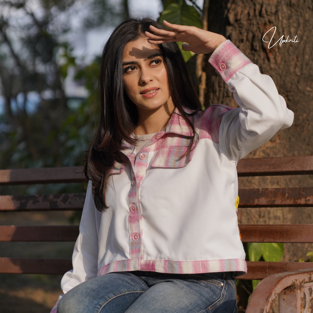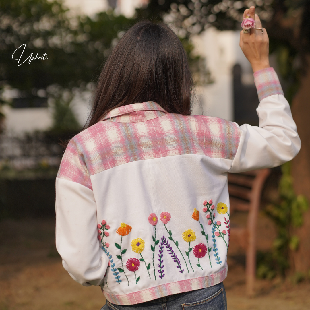 Presentamos el Floral Oasis de Upkriti: una chaqueta de lino blanco de tweed rosa con un hermoso bordado floral a mano en la parte posterior es una adición definitiva a tu guardarropa de invierno.