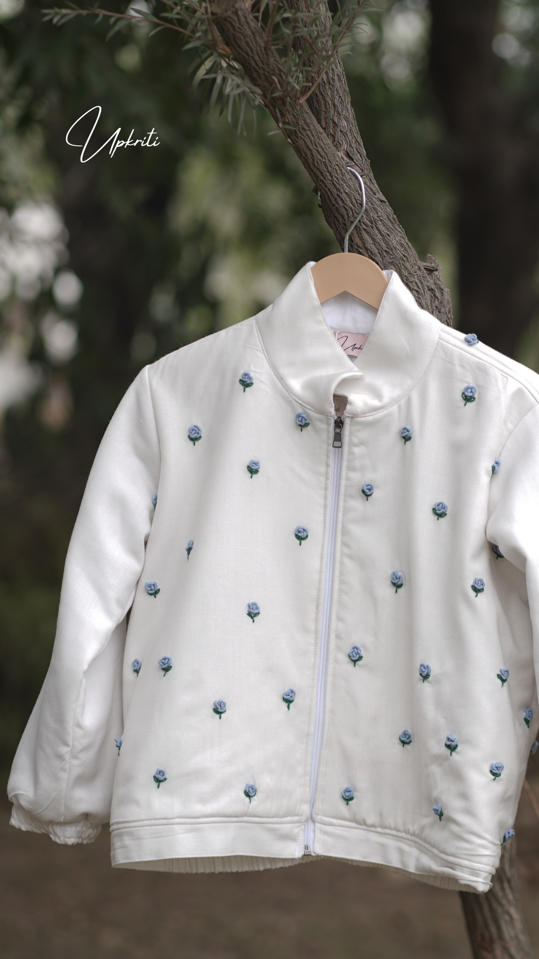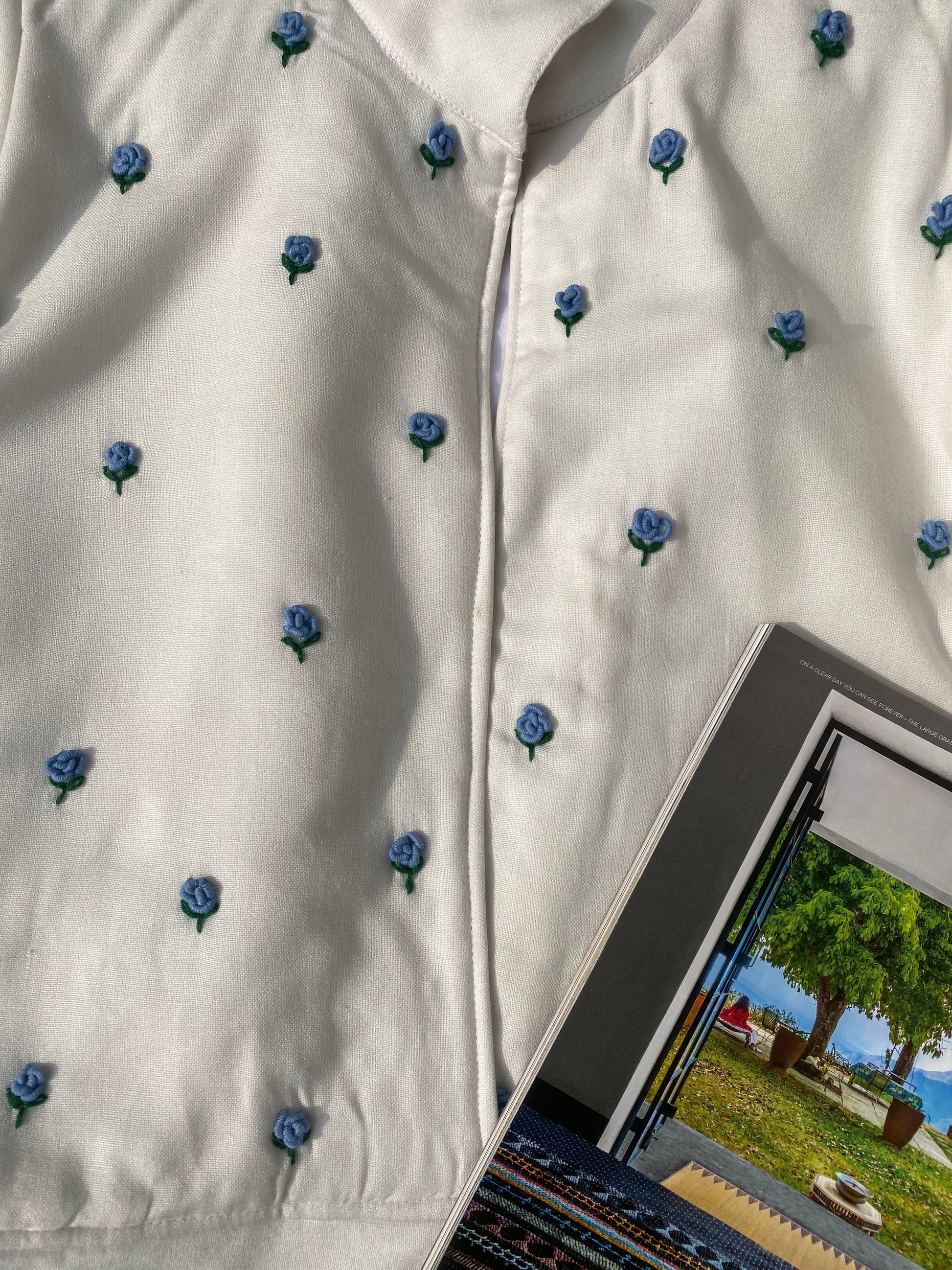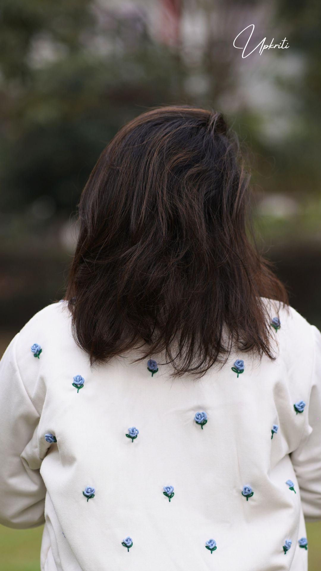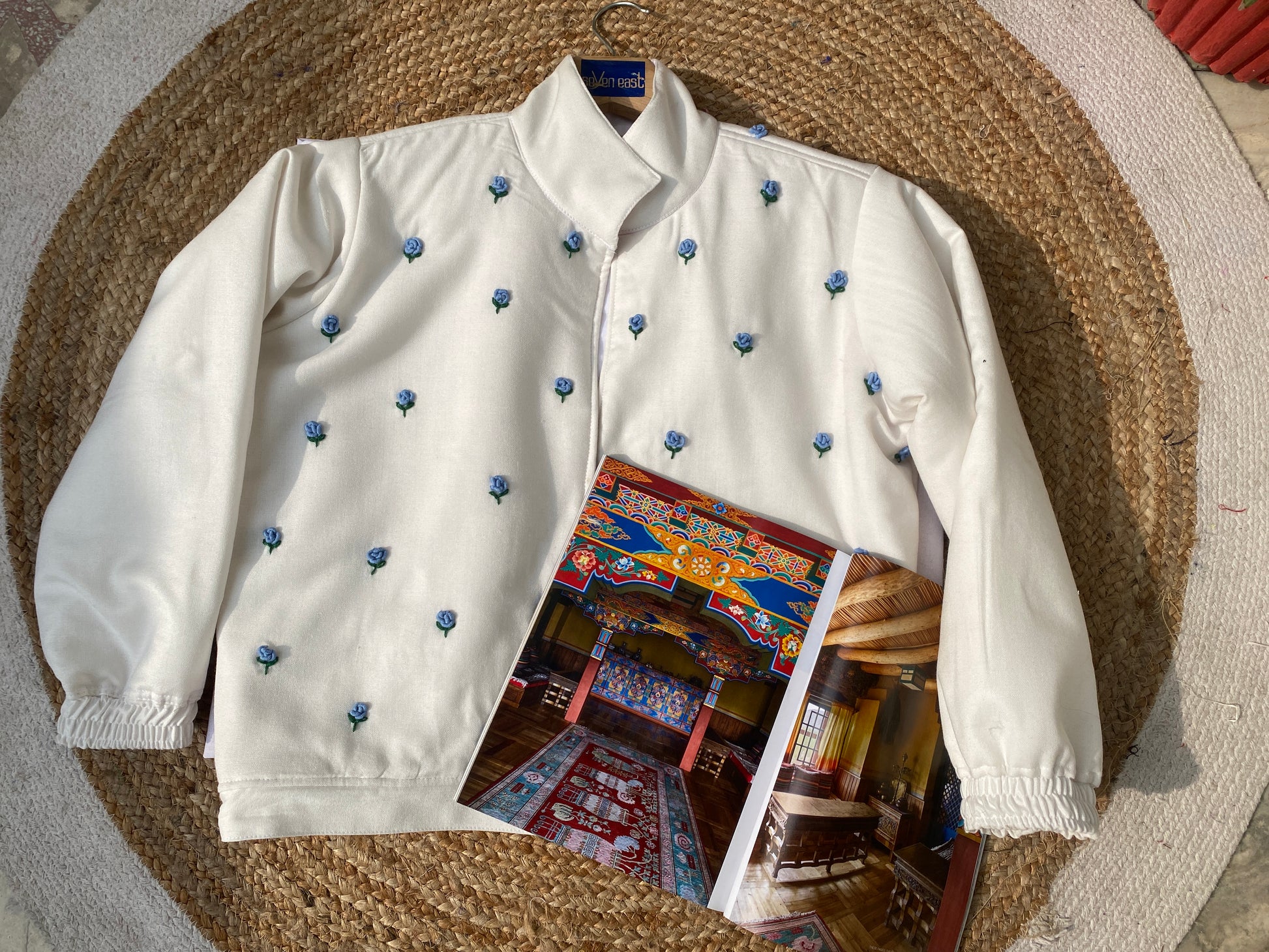 Presentamos una chaqueta de lana blanca bordada a mano de Upkriti.