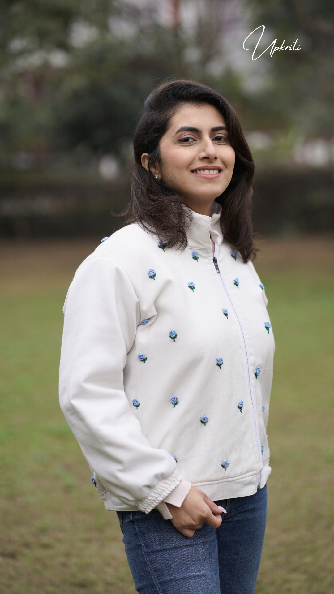 El ajuste de la chaqueta la hace perfecta para combinar con jeans o faldas de cintura alta y lucir tu top favorito. La chaqueta también cuenta con una cremallera frontal completa, mangas largas y un hermoso bordado a mano por todas partes.